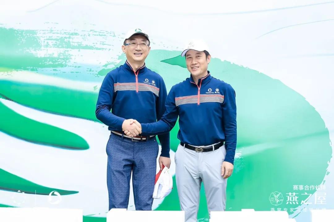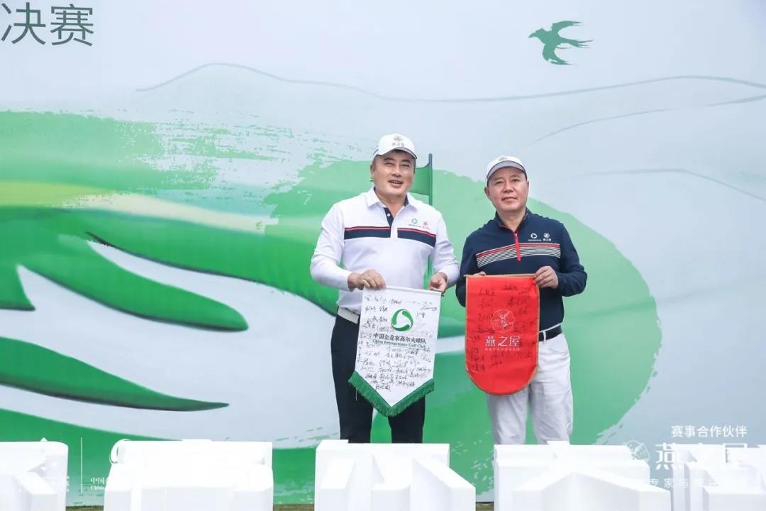 ▲中國企業家高爾夫球隊隊長王均豪與燕之屋高爾夫球隊隊長牛雷交換隊旗