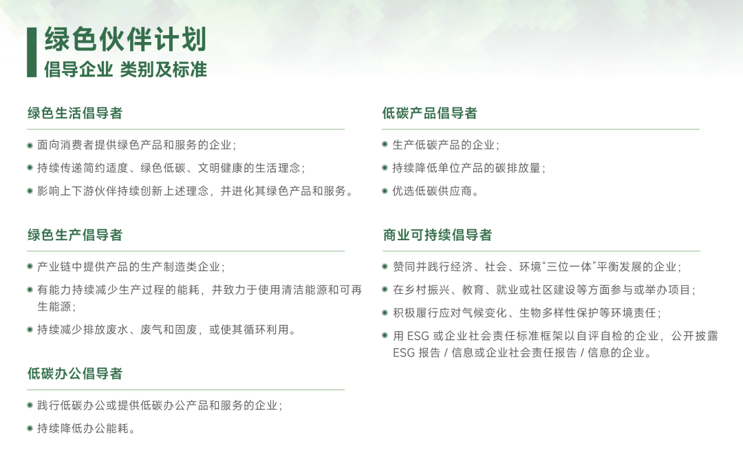 “綠色伙伴”是經濟可持續、環境可持續和社會可持續兼容并序的均衡發展中堅持創新的企業。我們希望同眾多企業一起,面向消費、市場和未來倡導綠色理念,踐行綠色方法,實現可持續發展的企業目標和經濟目標。
