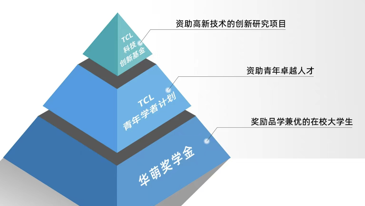TCL公益基金會設立“TCL高校捐贈體系”,以“TCL科技創新基金”、“TCL青年學者計劃”、“華萌獎學金”三大項目,聚焦科技創新激勵、青年學者支持和優秀學生資助。截至2023年底,“TCL高校捐贈體系”已在華南理工大學、南開大學、四川大學、電子科技大學、西北工業大學、西安電子科技大學、哈爾濱工業大學落成,累計投入1930萬元,資助科研項目14項,青年學者8人,學生238人