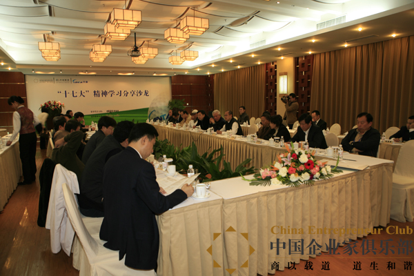 中國企業家俱樂部執行主席劉東華的開場發言點出了本次座談會的兩個價值。第一是中城聯盟和俱樂部“兩支友軍的勝利會師,這么多優秀企業家代表聚在一起很不容易”,是難得的切磋交流機會;第二,企業做到一定的規模,特別是政策敏感的行業如地產,“不可能不看天氣,而且是看長遠的天氣”,全面準確地領會和把握十七大精神,對企業下一步發展很有必要。